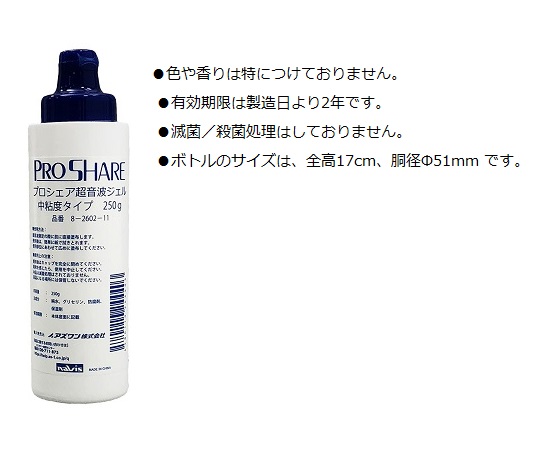 ●超音波伝導性に優れたゼリーです。●水溶性で紙でも簡単にふき取れます。●片手でキャップの開け閉めが可能で、検査時の手間が省けます。●容量:250g●中粘度タイプ