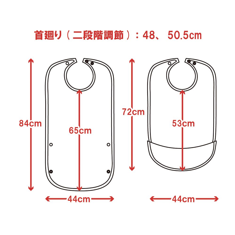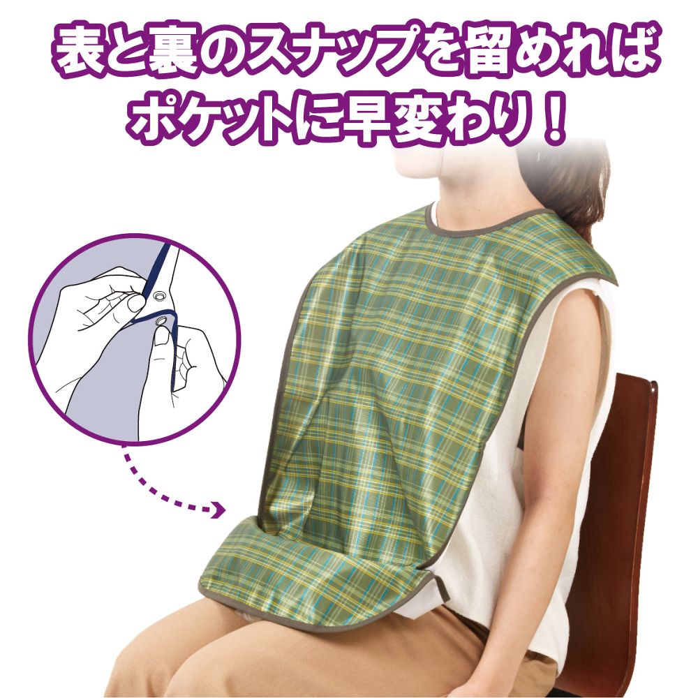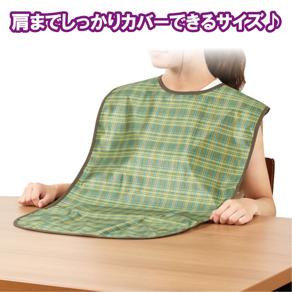 ●裾はスナップボタンを留めるとポケット状になり、食べこぼしをキャッチします。●裏面はソフトな防水布で、衣類を汚れからしっかり守ります。●材質:表面/ポリエステル100%、裏面/PVC(塩化ビニル樹脂)73%・ポリエステル27%●首まわり:480・505mm(スナップボタン式)●幅×丈:440×840mm●耐熱温度:150℃(アイロン)●洗濯方法:洗濯可/脱水可/乾燥機可(家庭用60℃)●防水加工●色:グリーン