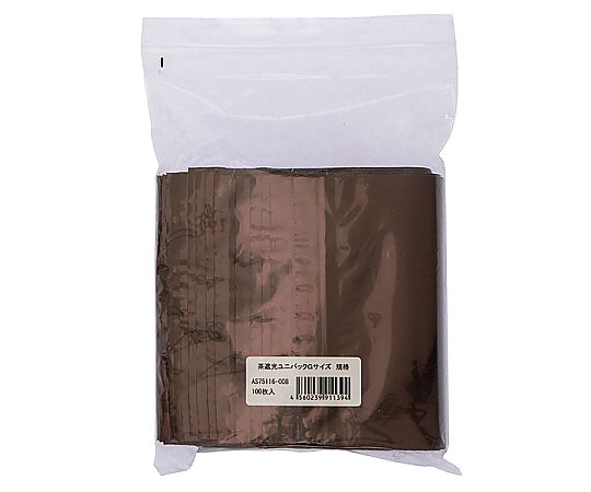 ●濃い茶色で遮光するチャック付きポリ袋(ユニパック)です。●遮光性を必要とするお薬や、中身を見せたくない検査用品等をお入れ頂くことに適しています。●白地部分にはボールペンやマジックで文字の書き込みが可能です。●日本製です。●Gサイズ●幅×チャック下(mm):140×200●厚み(mm):0.05●材質:PE(ポリエチレン)●種類:チャック付き遮光袋●販売単位:1箱(100枚/袋×10)