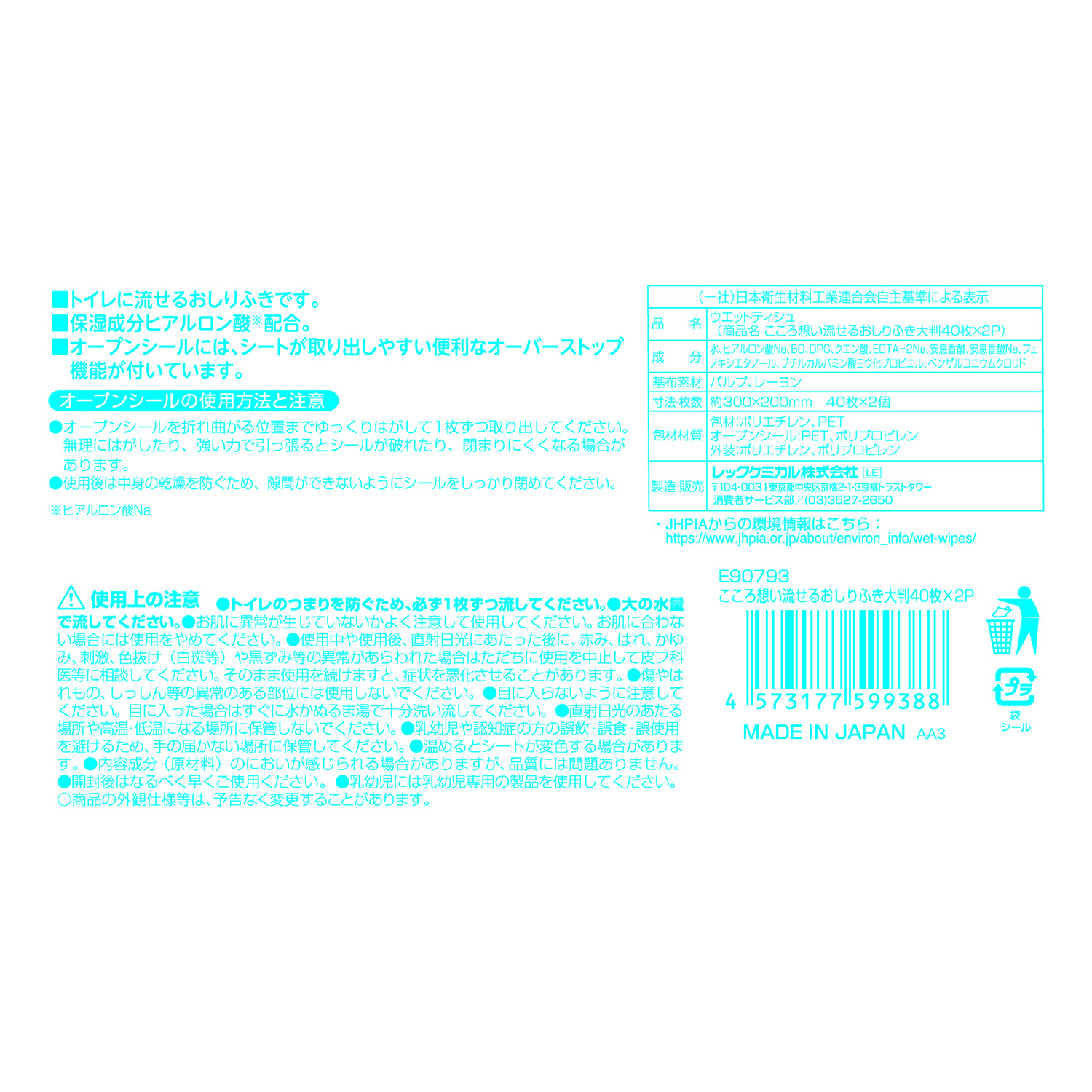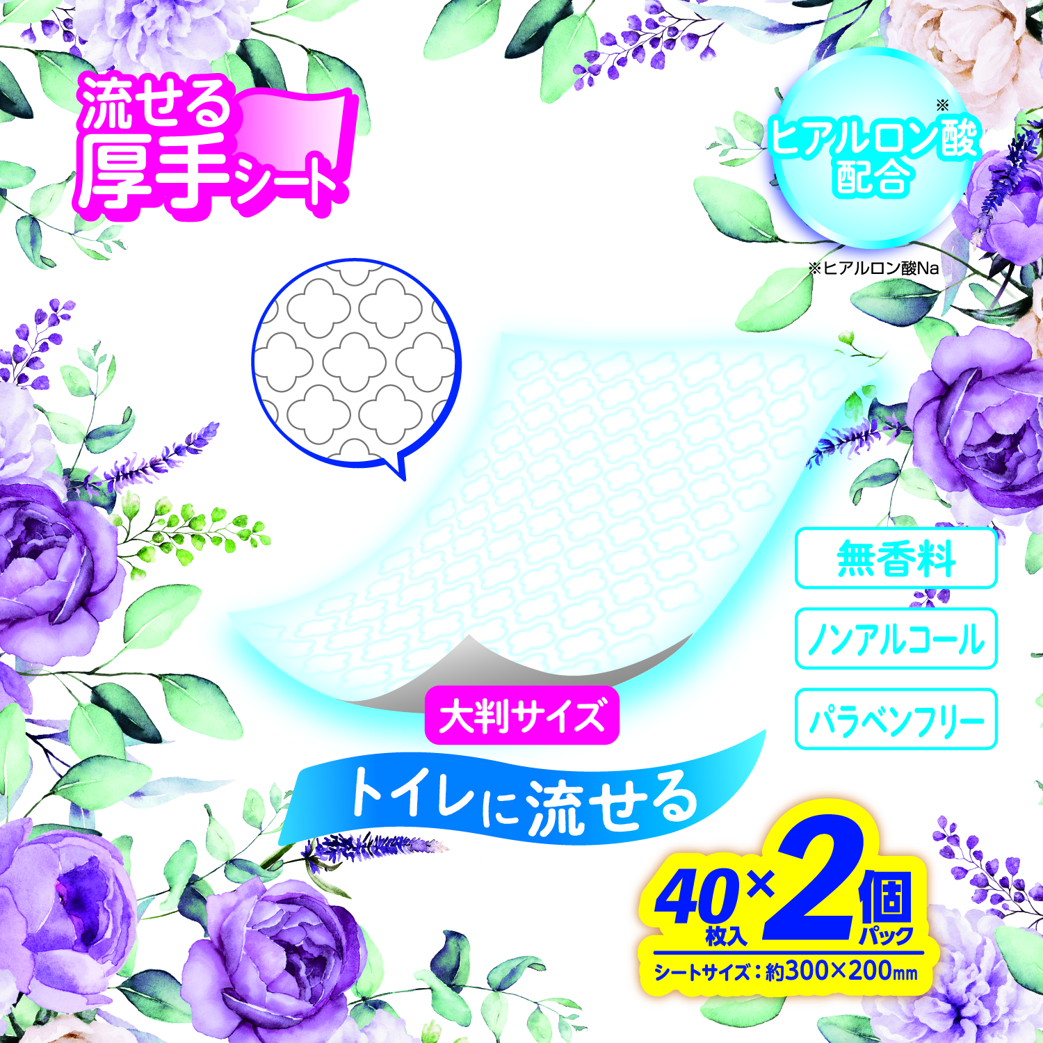 ●成分の99%以上が純水でできており、トイレに流せます。●毎日の生活になじむ優しいデザインのパッケージです。●シート材質:パルプ・レーヨン●主成分:水・BG・DPG・クエン酸・EDTS-2Na・安息香酸・安息香酸Na・ブチルカルバミン酸ヨウ化プロピニル・その他●保湿成分:ヒアルロン酸Na配合●サイズ:300×200mm●厚手シートタイプ●大判サイズ●大人用●ノンアルコール・パラベンフリー・無香料・無着色●※乳幼児には使用できません。