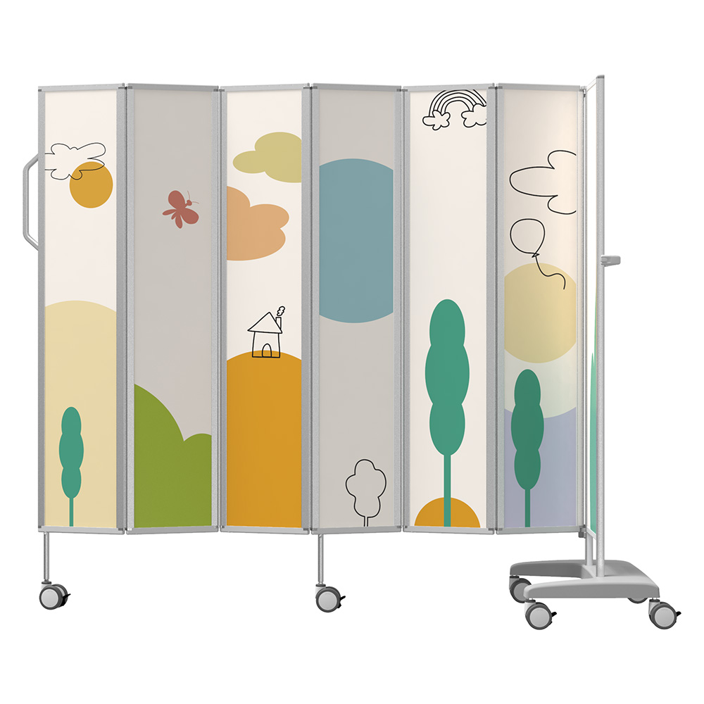 ●かわいい絵柄付のモバイルパーテーションです。●パネルはメラミン樹脂ラミネート加工されており、キズが付きにくく、難燃性にも優れています。●パネル幅×高さ(mm):1800×1650●パネル数:6●材質:フレーム/アルミニウム、パネル/PS(メラミン樹脂ラミネート加工)●製品構成:パネル 6枚+キャスターベース×1枚●パネル幅(1枚あたり):300mm(ハンドルを含まず)●キャスターベースサイズ:590×400mm