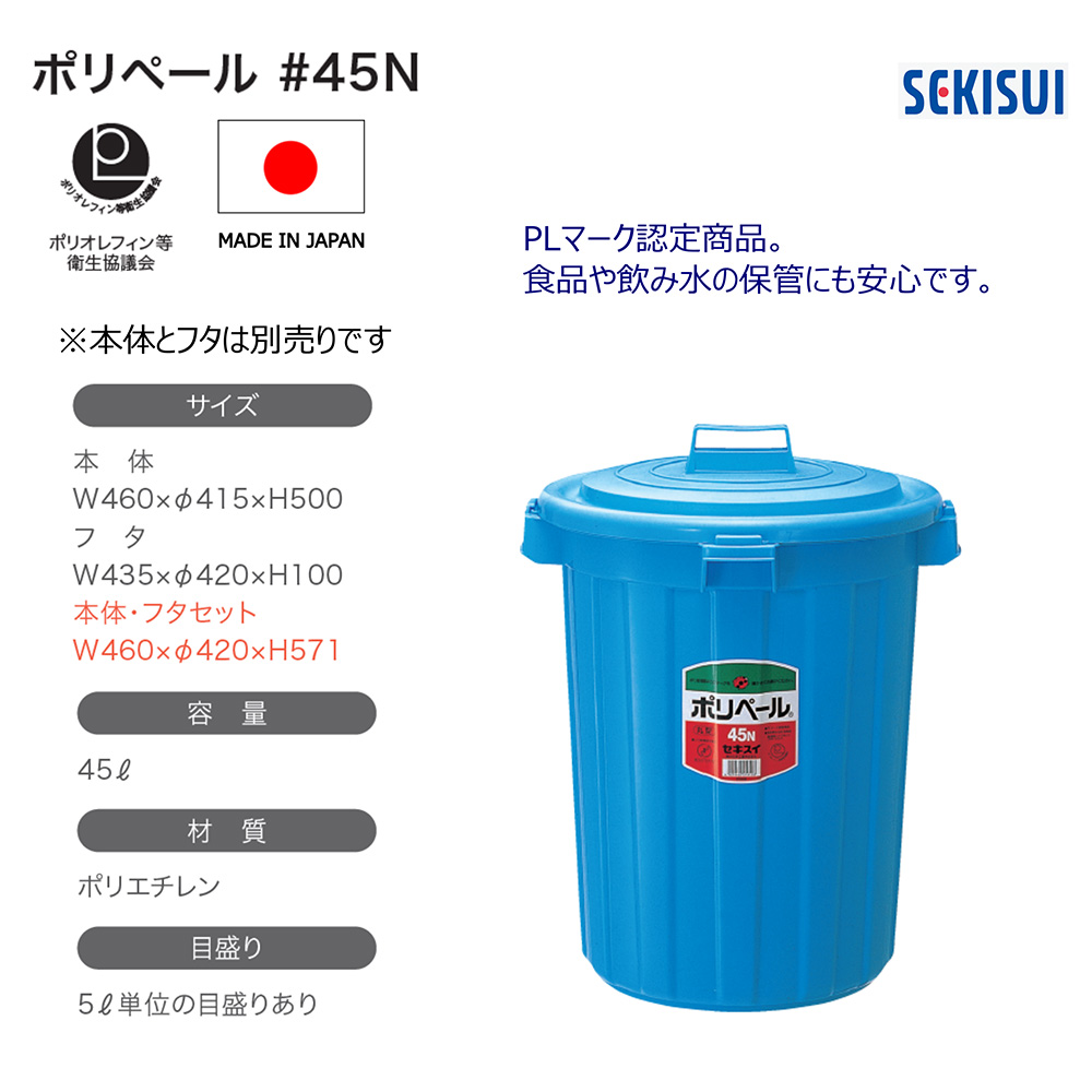 ●容量:45L●材質:PE(ポリエチレン)●型番:P45NB●サイズ(mm):φ415×500●PE(ポリエチレン)製・ブルー●※フタ・ゴミ袋は付属していません。