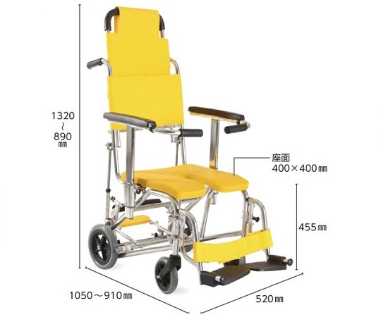 ●脚部は移乗に便利なスイングアウト式です。●座シートはおしりにぴったりフィットします。●規格:U字シート●幅×奥行×高さ(mm):520×910~1050×890~1320●材質:本体/ステンレス、シート/EVA●座面サイズ:400×400mm●座面高さ:455mm●肘掛け高さ:220~260mm(20mm間隔・3段階調節)●リクライニング角度:100°~118°●キャスター径:前輪/φ6インチ、後輪/φ8インチ●重量:19.6kg●転倒防止バー・足踏みブレーキ付き●組み立て式●介護保険適用(特定福祉用具)