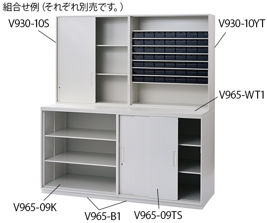●部屋の間仕切りにも使える薄型タイプ。●用途にあわせて自由にユニットを組み合わせできます。●奥行が310mmと短いので、部屋の間仕切りとしても使用できます。●扉にはラッチと鍵がついています。●天袋と上部カバーを天井の隙間に組み合わせて取り付け、しっかりアジャストすることで転倒を防止します。●型番:V930-10S●タイプ:上置き専用●仕様:2枚引き戸●幅×奥行×高さ(mm):900×310×1030●重量(kg):30.6●付属棚板(枚):2●材質:本体/スチール(粉体塗装)、窓/PMMA(アクリル)●組み立て式(要工具)●有効内寸法:865×257×983mm●※床に置く際は、必ず下置き用ベース(8-4924-10)をご使用ください。●※運送費・搬入費・据付費・組立費等が別途必要です。お問い合わせください。