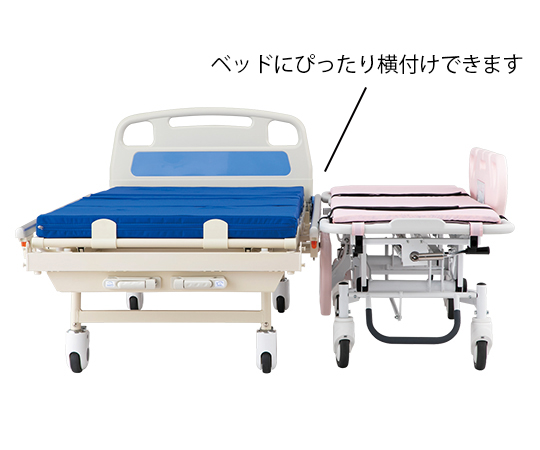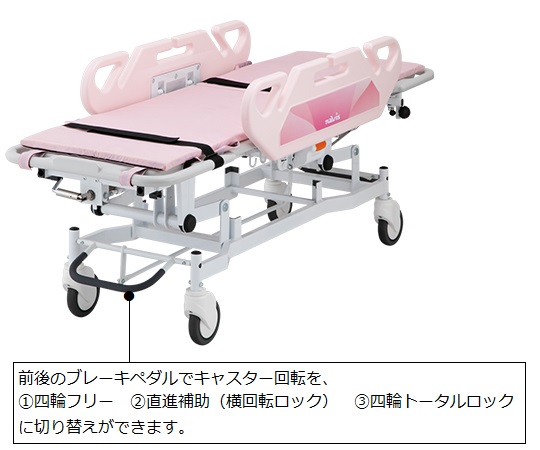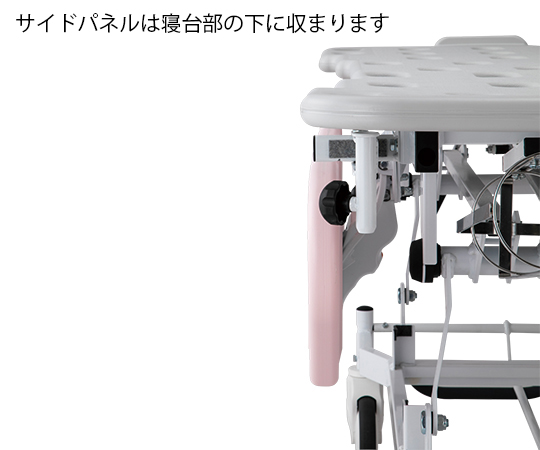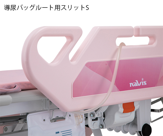 ●標準装備のマットレス20mm?50mmにボリュームUP!!●666mmの本体幅と、垂直に上下するサイドパネルにより、病棟の狭いスペースでも搬送・移乗がしやすいです。●キャスターの前後間距離が1268mmと短く、方向転換の小回りが利きます。●<ドレーンチューブ用スリット>●▼サイドパネルは、片側3ヶ所にドレーンチューブ用スリットがあります。●<軽い操作性>●▼Φ150mmの単輪キャスターですので、軽い力で方向転換が可能です。●<ドレーンバック用フック>●▼寝台部下の左右にドレーンバックを掛けられるフックを備えています。●<格納式の受け金属>●▼イルリガートルを使用しない際は邪魔にならないよう折りたためます。(イルリガートルは本体フレームに収納します)●<イルリガートル>●▼高さ調整できる4本架のイルリガートルは、ストレッチャー本体の前後左右4ヶ所に取り付けることができます。(受け金属は2個付属しています)●本体側面に導尿バッグを吊り下げるホルダーが付き、チューブの外れ事故を予防するサイドパネル形状を採用しています。●補助ガスダンパー付きですので、患者を載せていても寝台部を軽く上げることができます。●背もたれは水平角70°まで無段階で角度調整ができます。●キャスターは、四輪フリー・直進補助・四輪トータルロックに切り替えができます。●幅×奥行×高さ(mm):666×1900×530~810●色:ピンク●材質:本体フレーム/スチール(粉体塗装)、サイドパネル・寝台部/抗菌HDPE樹脂、マットレスカバー/ナイロン、マットレスカバー/ナイロン、マットレス中材/ポリウレタン、横置きボンベ架/ステンレスSUS304、縦置きボンベ架/スチール(粉体塗装)、イルリガートル架/ステンレスSUS304・ABS樹脂●付属マットレスサイズ:550×1750×50mm●寝台部高さ:530~810mm●ボンベ対応サイズ:Φ110mm(500L)●キャスター径:Φ150mm●耐荷重:125kg●重量:本体/約70kg、マットレス(標準)/約2.5kg●付属品:イルリガートル架、イルリガートル架受け金具(2個)、マットレス(標準)、横置きボンベ架、安全ベルト(2本)