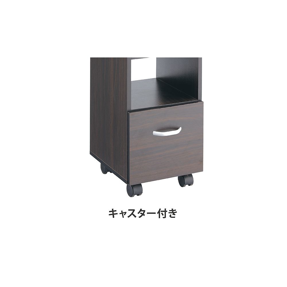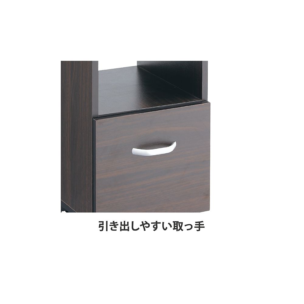 ●天板は落下防止の取手付きです。●シンプルで洗練されたデザインです。●材質:化粧合板●有効内寸法:棚/約260×340×175mm、引出し/約210×220×230mm●キャスター:φ50mm●重量:13.5kg●色:ブラウン●幅×奥行×高さ(mm):325×375×780