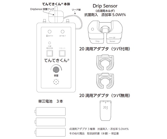 ●輸液終了および点滴チューブが閉塞して滴下が10秒以上止まっているとアラームとLED点灯(赤)でお知らせします。●クレンメ全開(流液状態)でも輸液を正常に検知でき再び点滴状態に戻せます。●液下確認用LEDランプ(緑)が本体とセンサー部で点滅し、点滴の滴下状態の目視に役立ちます。●輸液方式:自然落下方式●材質:ABS樹脂(点滴筒ホルダー(センサー部)・アダプターのみ抗菌加工)●電源:単3乾電池×3本(テスト用付属)●サイズ:本体/75×35×135mm、点滴筒ホルダー(センサー部)/60×32×30mm●重量:本体/250g(電池含む)、点滴筒ホルダー(センサー部)/30g●麻酔20滴用●セット内容:本体×1台、点滴筒ホルダー×1個、20滴用アダプター(ツバ付き×2種・ツバ無し×1種)×各1個●※点滴量をコントロールするものではありません。●※輸液加温でのご使用不可です。●型番:TS-2