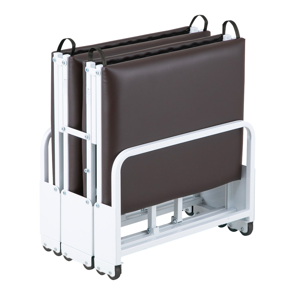 ●コンパクトに収納できます。●ベッドだけでなくベンチとしても使用可能です。●折りたたんだ状態でも立つ、自立式です。●幅×長さ×高さ:600×1990×400mm●重量:約22kg●材質●▼本体:スチール塗装仕上げ●▼マット:PU(ポリウレタン)レザー●折りたたみ時サイズ:約600×360×650mm●マットサイズ:600×1910mm●床面高さ:約270mm●キャスター:φ50mm、PP(ポリプロピレン)製(ストッパーなし)●マット厚み:30mm●耐荷重:約150kg