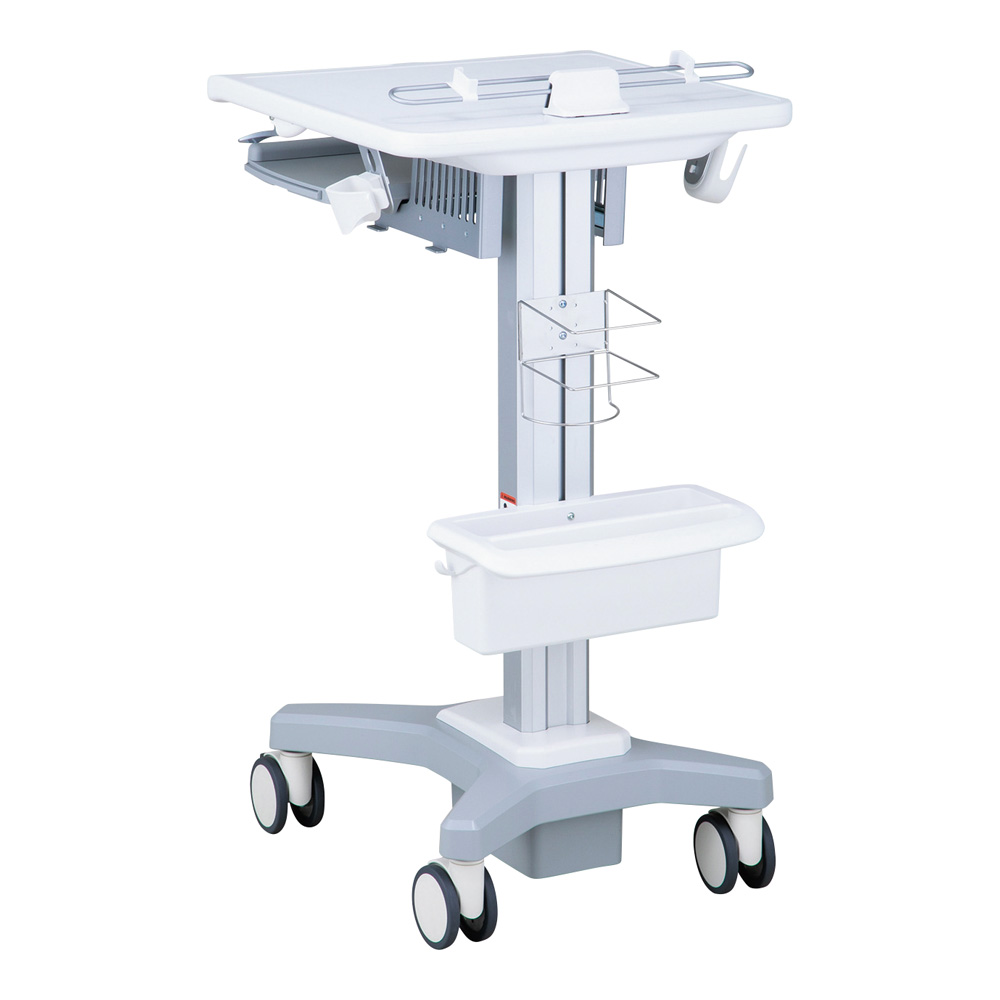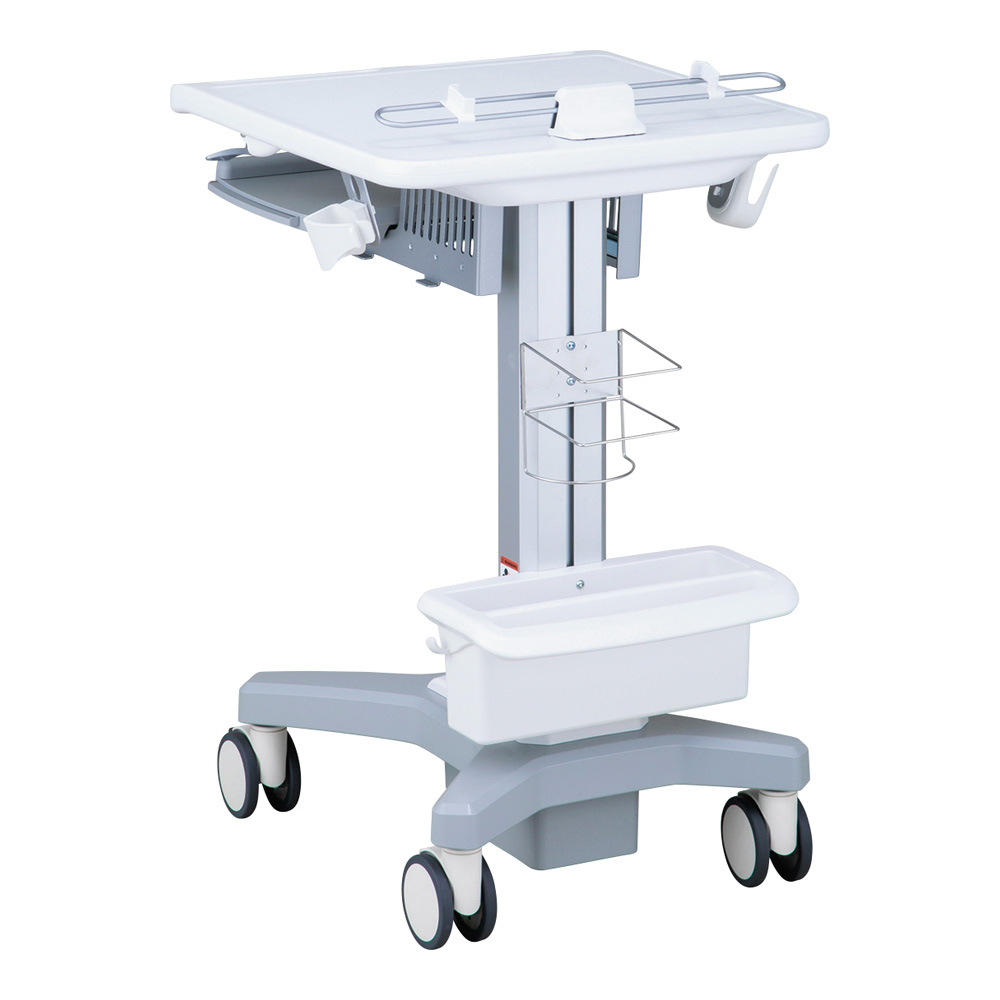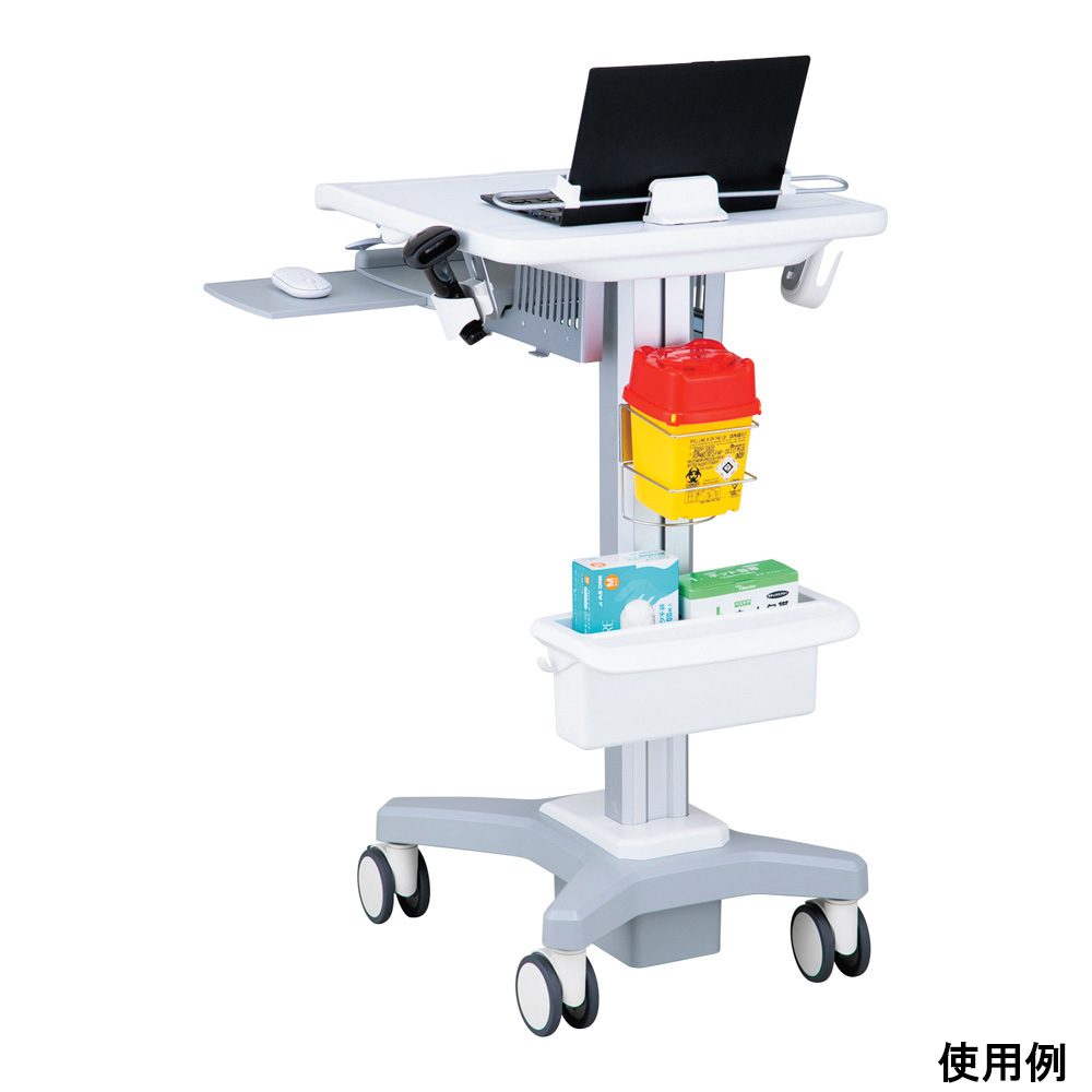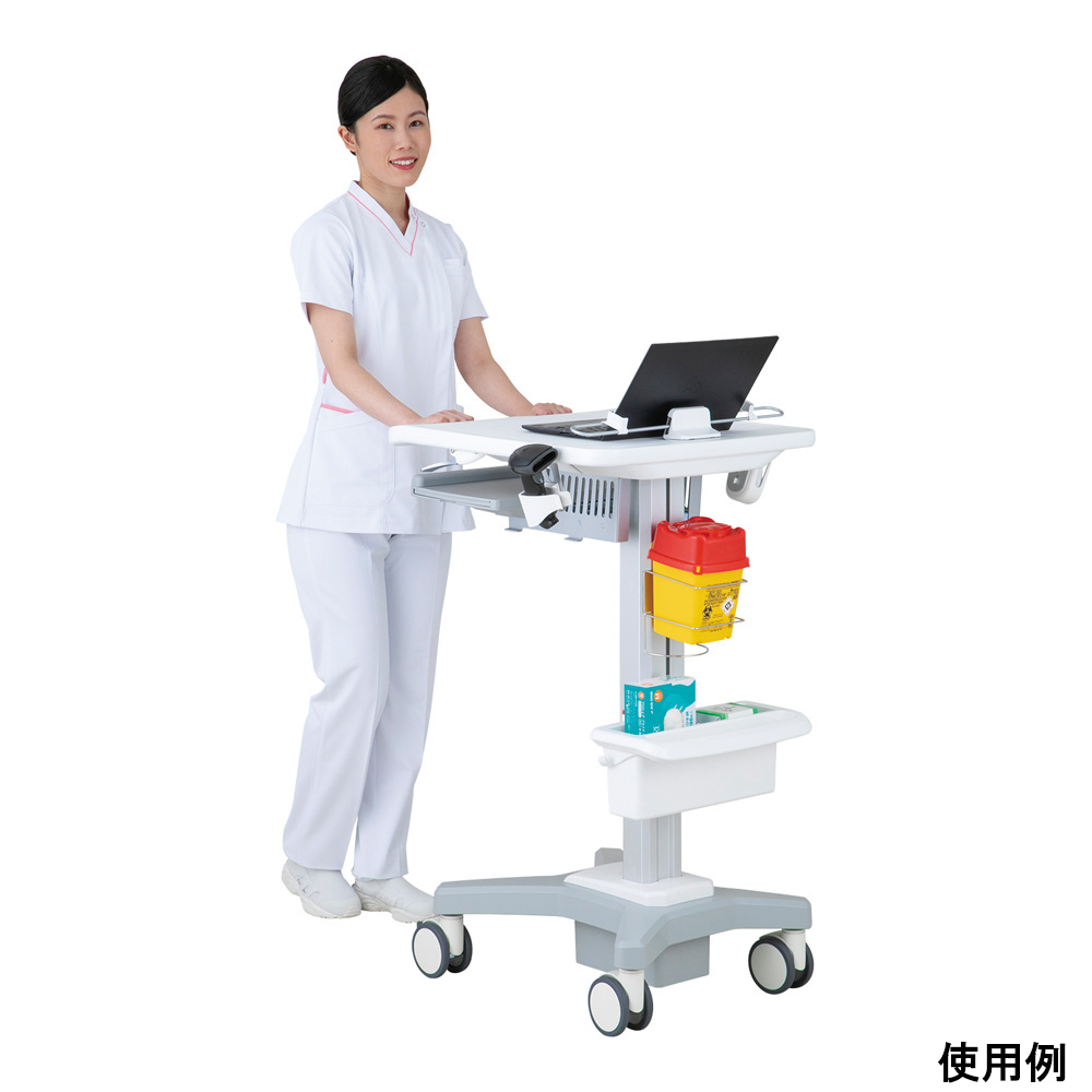 ●ベース・支柱がアルミ製、天板は樹脂製ですので、スムーズに移動が行えます。●天板高さはガスダンパー式ですので、軽い力で840~1240mmに調整可能です。●高さ900mmのナーステーブルにカンチしたり、天板下に収納したりできます。●仕様:本体●幅×奥行×高さ(mm):550×580×840~1240●入数:1個●材質:本体/アルミニウム、天板/プラスチック●天板サイズ:550×580mm(有効サイズ515×380mm)●天板耐荷重:9.5kg(アクセサリー含む)●キャスター:Φ100mm熱可塑性ゴム・PP(ポリプロピレン)製(2輪ストッパー付き)●本体重量:16.7kg●組み立て式(要工具)