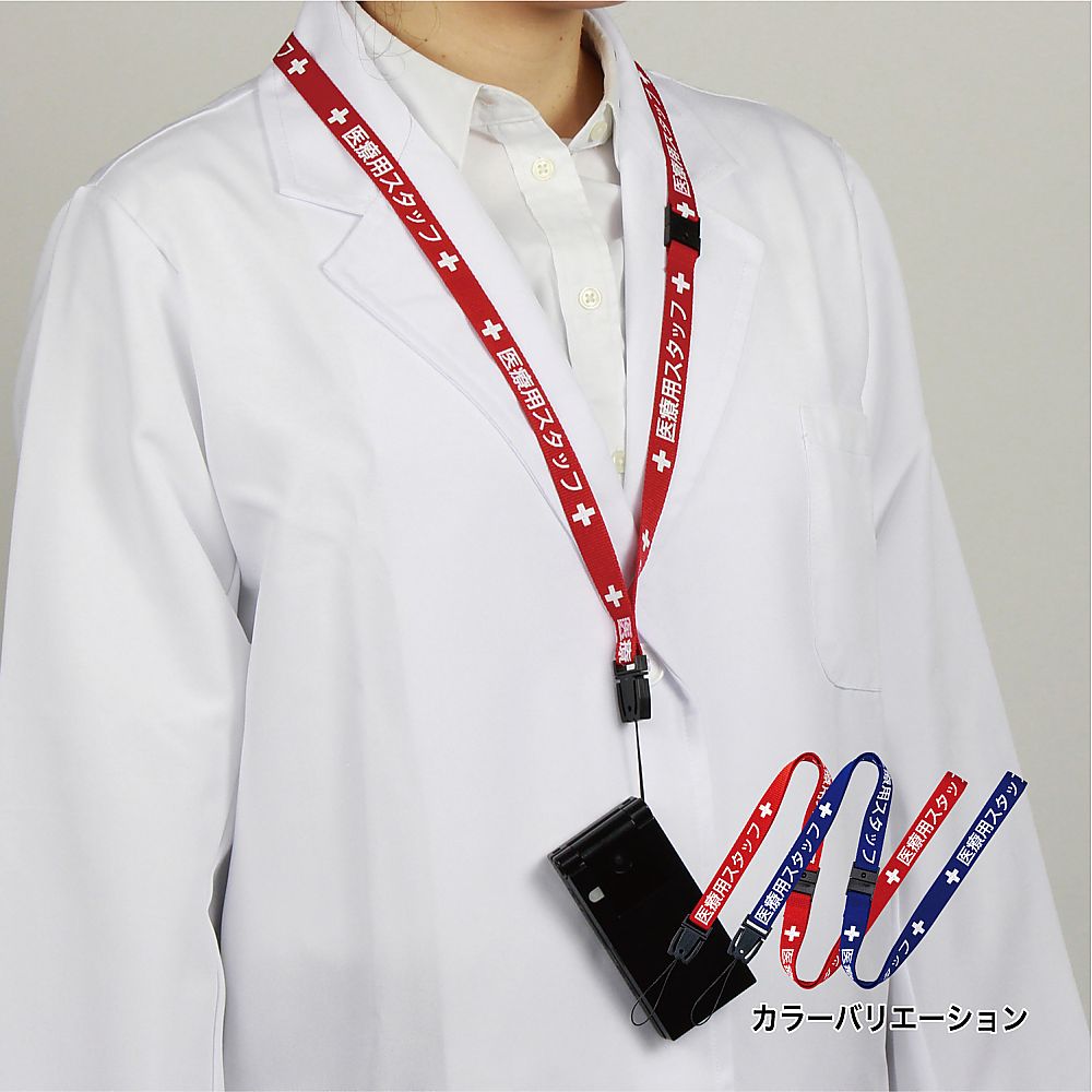 ●強く引っ張るとひもが外れる安全装置付きです。●ワンタッチで取り外せる脱着式です。●テープ幅×全長※(mm):15×900●色:赤●材質:テープ/R-PET(ポリエチレンテレフタレート)、着脱パーツ/POM樹脂・ナイロン●印字内容:医療用スタッフ●入数:1本●※全長はテープの円周です。●※病院名等の名入れも可能です(100本~)。別途お問い合わせください。
