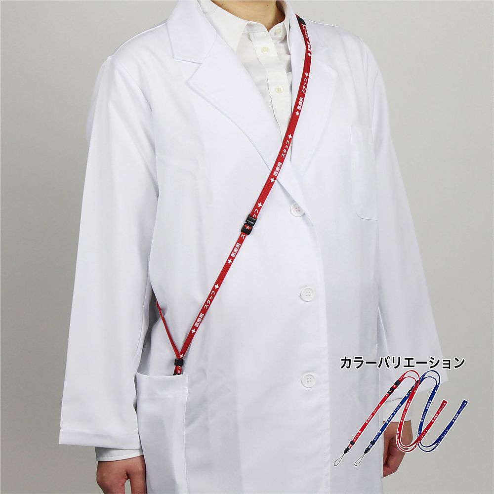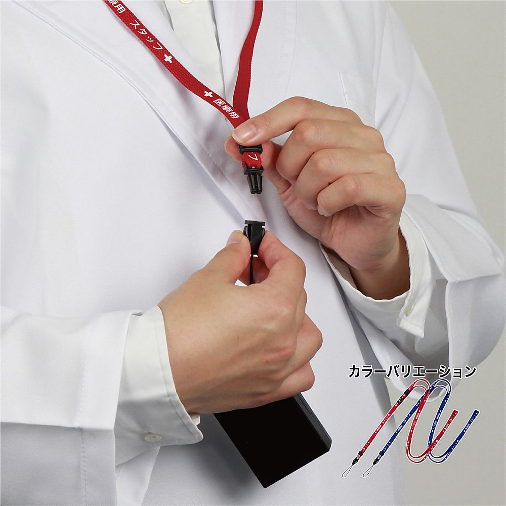 ●強く引っ張るとひもが外れる安全装置付きです。●ワンタッチで取り外せる脱着式です。●十分なテープ長さがありますので、首から下げても白衣のポケットにしっかり収まります。●テープ幅×全長(mm):10×1600●色:赤●材質:テープ/R-PET(ポリエチレンテレフタレート)、着脱パーツ/POM樹脂・ナイロン●長さ調節範囲:900~1600mm●印字内容:医療用スタッフ●入数:1本●※全長はテープの円周です。●※病院名等の名入れも可能です(100本~)。別途お問い合わせください。