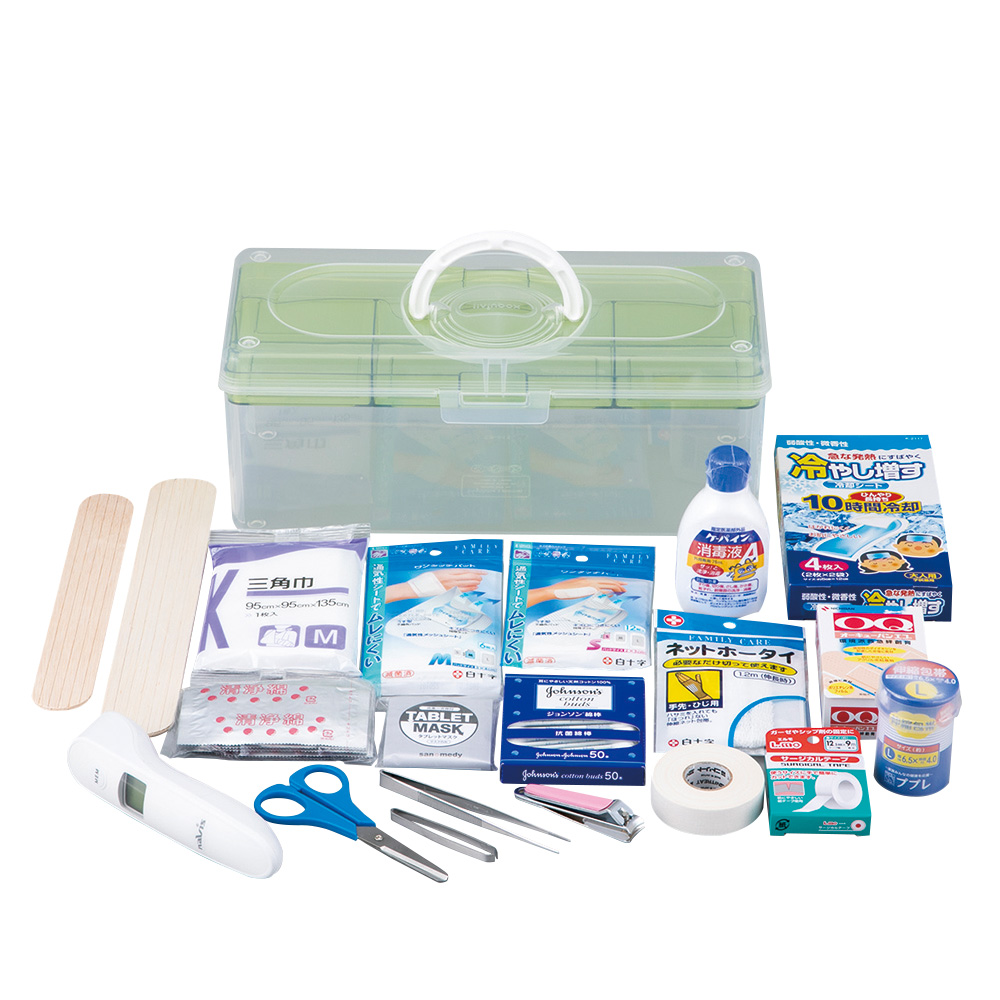 ●救急時に必要なアイテムを揃えたセットです。●非接触体温計(1秒計測)が入っており救急時に迅速な対応が可能です。●サイズ(mm):348×153×139●セット内容●▼非接触式体温計NV210●▼救急ケース●▼FCワンタッチパッド(S/12枚入・M/6枚入)●▼伸縮包帯(L)×1巻●▼ネットホータイ(手先・ひじ用×1枚)●▼絆創膏アソート36●▼サージカルテープ×1巻●▼三角巾(M)●▼消毒液(75mL)●▼綿棒(50本入)●▼清浄綿×5枚●▼副木(中)●▼副木(小)●▼冷却シート×4枚●▼テーピングテープ×1巻●▼一方弁マスク●▼救急用ハサミ●▼ピンセット●▼毛抜ピンセット●▼爪切り●※セット内容は予告なく変更になる場合があります。
