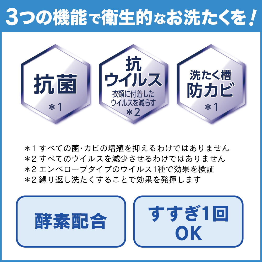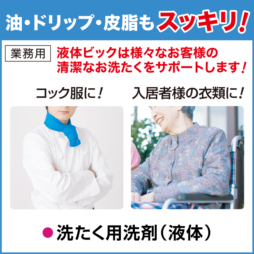 ●油、ドリップ、皮脂もスッキリ!●液体タイプ●水30Lに対して、30mL 【キャップ約(1杯+0.5杯)】汚れに応じて適宜増減します。●抗菌※1●抗ウイルス※2●洗たく槽防カビ※1●酵素配合●すすぎ1回OK●コック服、ダスター、タオル、肌着などのお洗たくにおすすめ●※1すべての菌・カビの増殖を抑えるわけではありません●※2すべてのウイルスを減少させるわけではありません●※2エンベロープタイプのウイルス1種で効果を検証●※2繰り返し洗たくすることで効果を発揮します●蛍光剤配合●液性:弱アルカリ性●成分:界面活性剤〔19%、高級アルコール系(非イオン)〕、pH調整剤、安定化剤、酵素、蛍光増白剤●用途:綿・麻・合成繊維用●淡色の綿や麻、きなりの衣料は白っぽくなることがあるので、蛍光剤無配合の洗剤をおすすめいたします。