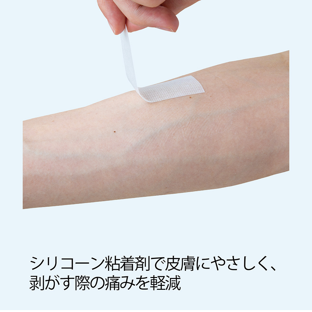 ●シリコーン粘着剤ですので皮膚にやさしく、剥がす際の痛みを軽減します。●アクリル系粘着剤と異なり、貼付から時間が経った後でも貼り直しが可能です。●剥がす際の肌へ負担の少なさと固定力を両立しています。●手でカットできる不織布テープです。●幅×長さ:25mm×5m●材質:テープ部/ポリエステル不織布・ポリウレタン、粘着剤/シリコーン系粘着剤