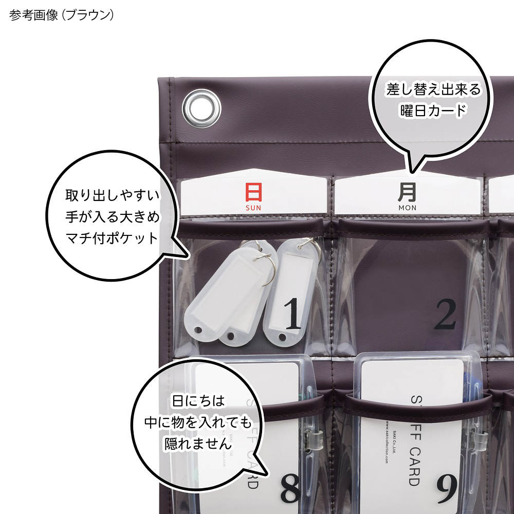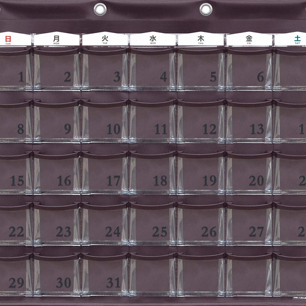 ●1ヶ月間の伝達や薬の管理用など色々な使い方ができます。●曜日は差し替えカード式です。●色:ブラウン●縦×横(mm):565×650●材質:台布・ポケット/PVC(塩化ビニル樹脂) ●ポケットサイズ:90×80mm●ポケット数:35個