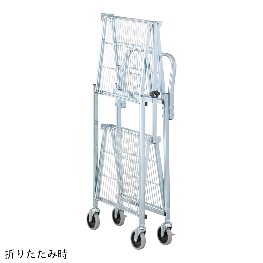 ●耐荷重にも優れ、収納時に場所を取らない折りたたみ式カートです。●ロック機能もあり、折りたたんでいても安定して自立します。●幅×奥行×高さ(mm):約850×460×945●重量(kg):約10●★入数:1台●材質:本体/炭素鋼、キャスター/PP(ポリプロピレン)・TPR(熱可塑性エラストマー)●折りたたみ時サイズ:約220×460×1110mm●棚間隔:約510mm●耐荷重(静的):全体/120kg、段/60kg●キャスター:φ101.6mm(ストッパー×2輪付き)