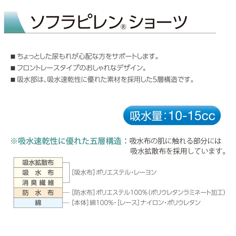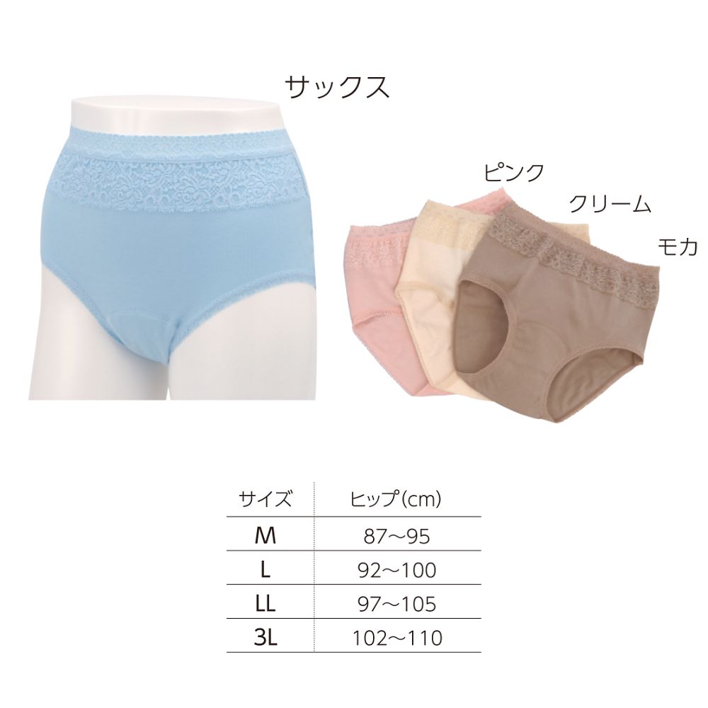 ●吸水性・速乾性・消臭性に優れています。●おしゃれなフロントレースタイプです。●婦人用●材質:本体/綿100%、レース/ナイロン・PU(ポリウレタン)、吸水布/ポリエステル・レーヨン、防水布/ポリエステル100%PU(ポリウレタン)ラミネート加工●吸収量:約10~15mL●洗濯方法:洗濯可/脱水可/乾燥機不可●色:サックス●ヒップサイズ(cm):M(87~95)