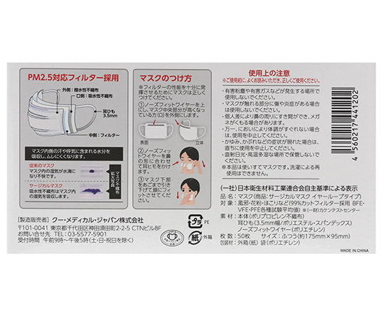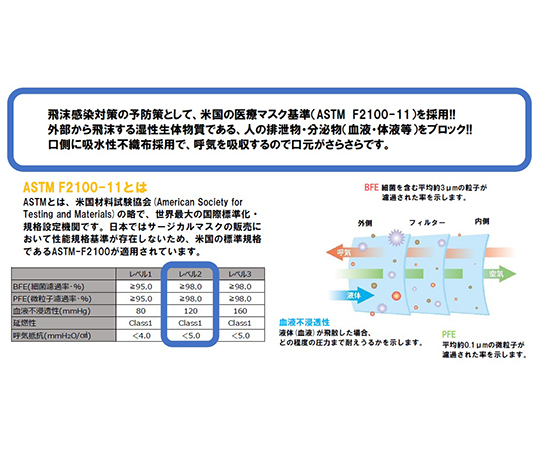 ●ASTM-F2100準拠、Level2の高品質サージカルマスクです。●花粉、ウイルス飛沫を99%カットします。●3層構造で顔にフィットするPEノーズワイヤー付です。●耳への負担を軽減する平ひもを採用しています。●口側吸水性不織布で、呼気を吸収しムレを軽減します。●色:ホワイト●入数:1箱(50枚入)●箱サイズ(mm):178×97×97●細菌ろ過効率(BFE):99.0%(3μm)●微粒子ろ過効率(PFE):99.0%(0.1μm)●材質:PP不織布(3層)、ノーズクリップ/プラスチック樹脂●イヤーループタイプ(丸ゴム)●サイズ(mm):175×95