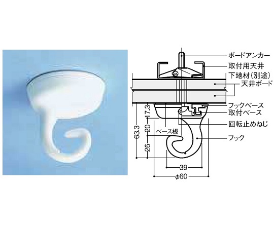 ●ベッド真上の天井に固定して使用するガードルハンガー吊り下げ用フックです。●先端形状はハンガーが外れにくい設計です。●樹脂製のため不快な金属音がしません。●点滴ハンガーの着脱がしやすいようにフック部が水平に回転します。●安全上先端部に一定以上の荷重や衝撃力が加わるとフック部の溝部から先端が破断する構造になっています。●※一般病室などに使用する一般タイプです。●材質:ベース板/ステンレス(SUS304)フックベース・取付ベース・フック/ガラス繊維強化PBT樹脂●径×高さ:φ60×63.3mm●ボードアンカー:タックルボルトM6●耐荷重:約3kg●一般病室用●色:アイボリー