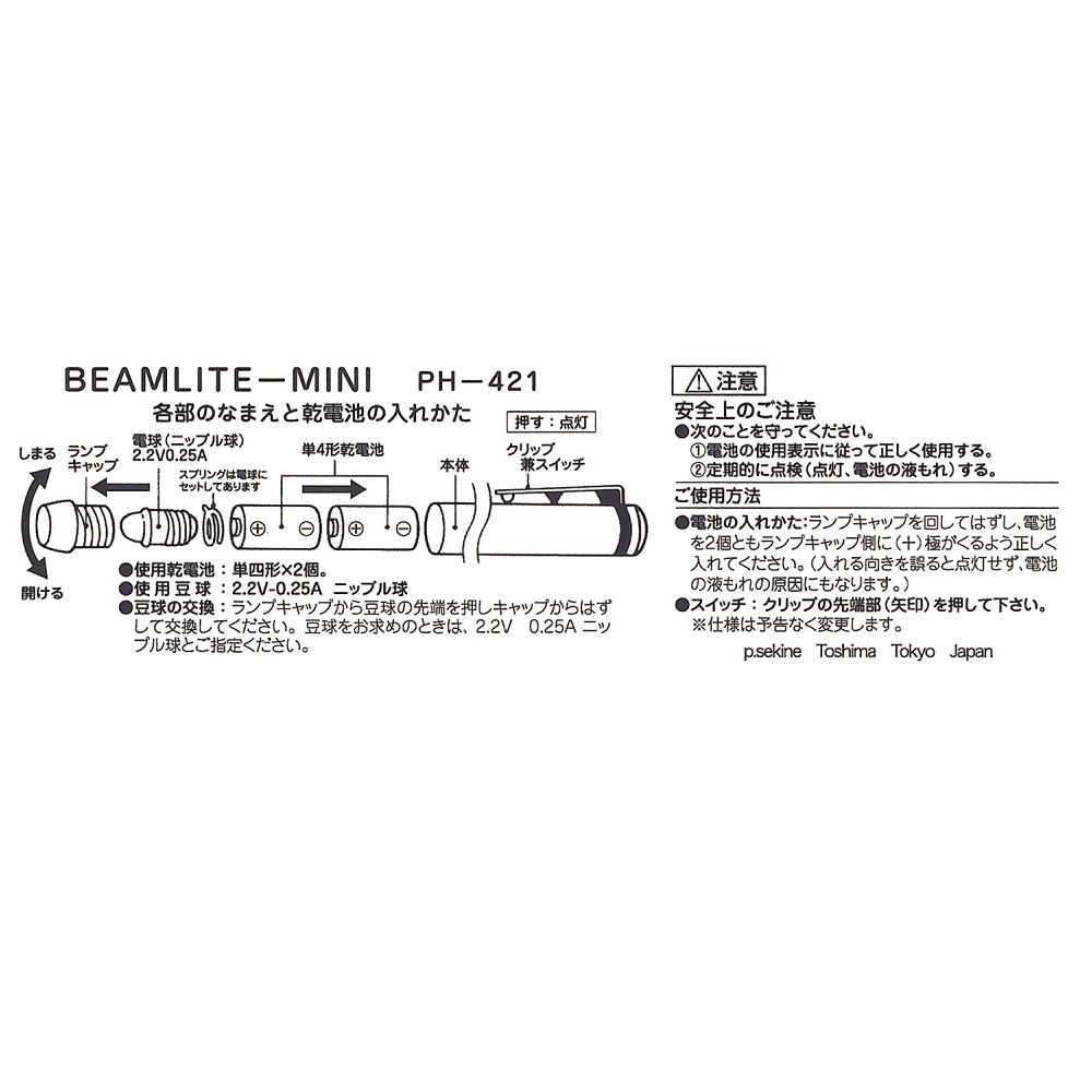 ●電源スイッチ クリッププッシュ式 クリップ部分を指で押して本体と接触している間、電源が入ります。●※ニップル球はフィラメントを使用しているため長時間の使用や大きな衝撃で球切れをおこす起こす事があります。その際は専用のPH421用ニップル球を購入ください。●重量:43g●長さ:128mm●ニップル球 2.2V、0.25A●付属品:単4マンガン乾電池 2本