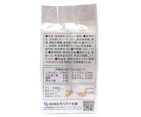●えん下困難な方の服薬時に是非!!●スプーン一杯分の適量パックです。●離水しにくく、むせにくいです。●水無しで錠剤・カプセルを飲め、顆粒・粉末もオブラートに包めば、服用可能です。●味:オレンジ●1包あたり重量(g):6●入数:1袋(10包入)●原材料名:甘味料(キシリトール)・還元麦芽糖・砂糖・ゲル化剤(増粘多糖類)・酸味料・香料・乳酸カルシウム・保存料(安息香酸ナトリウム・安息香酸)・着色料(黄色5号)●えん下困難者用食品たる表示の許可基準Ⅰ相当(厚生労働省)