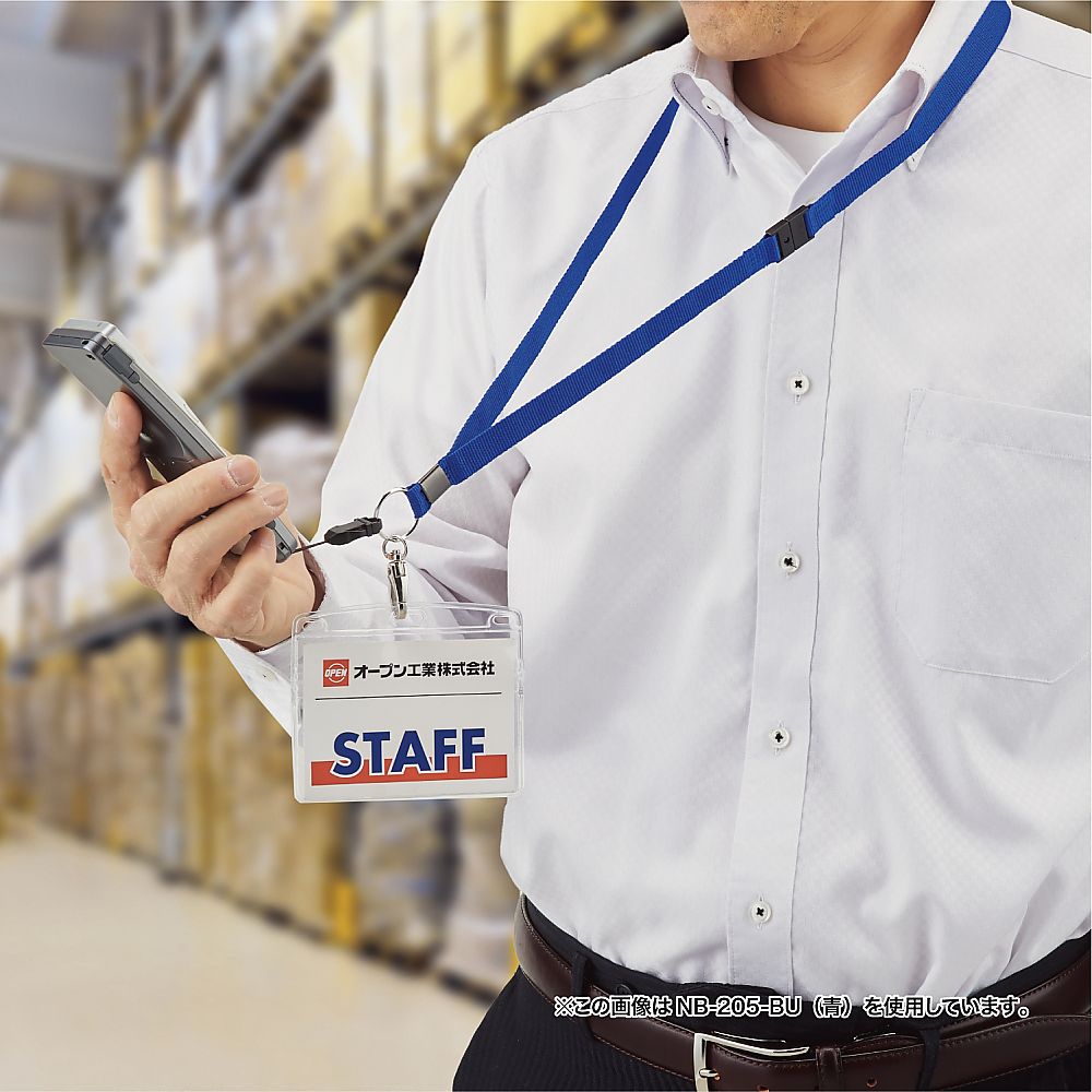 ●名札用ケースや鍵などが付けられるフック付きです。●負荷がかかるとひもが外れる安全装置付きです。●ワンタッチで取り外せる脱着式です。●色:黒●材質:テープ/R-PET(ポリエチレンテレフタレート)、着脱パーツ/POM樹脂・ナイロン●テープサイズ:15×900mm●型番:NB-205-BK●入数:1本●※全長はテープの円周です。●※病院名等の名入れも可能です(100本~)。別途お問い合わせください。