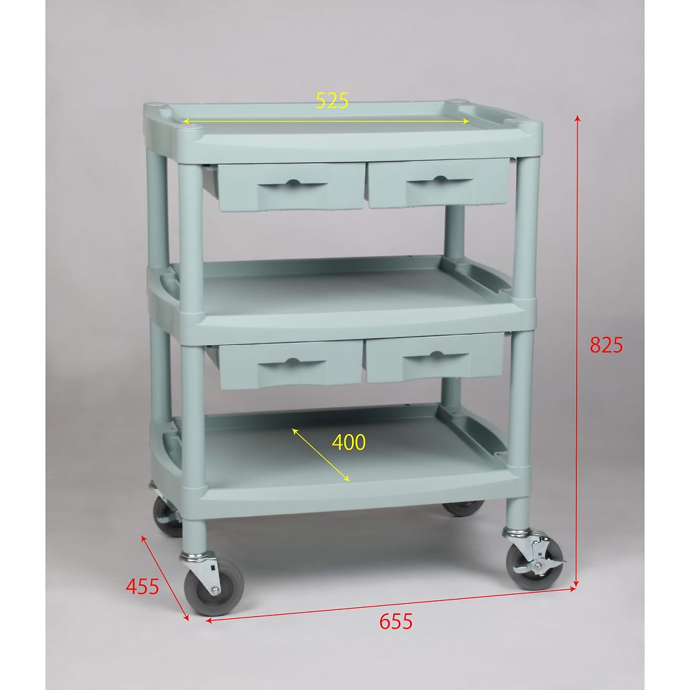 ●軽くて丈夫なオールプラスチック製です。●天板・棚板は枠付きで、落下防止に役立ちます。●材質:天板・引出しPP(ポリプロピレン)、支柱・ガードレール/ABS樹脂●棚板有効サイズ:525×400mm●棚板間隔:195mm●キャスター:φ100mmゴム製(対角ストッパー付き)●耐荷重:50kg/段●引出し内寸法:199×350×76mm●組み立て式●引出し4個付き●幅×奥行×高さ(mm):655×455×825●※ハンガー・サイドボックスは別売です。※サイズはガードレールを含んだ高さです。●3段●型番:Y201K