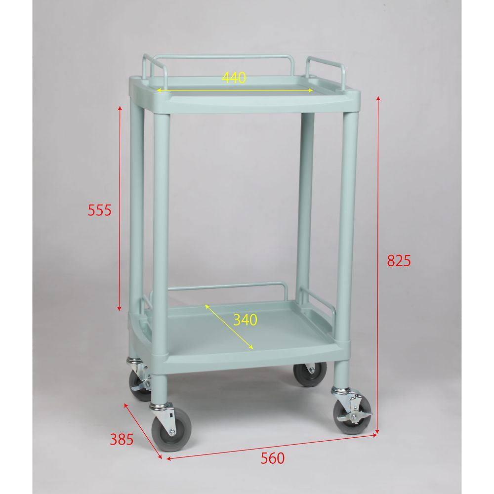 ●軽くて丈夫なオールプラスチック製です。●天板・棚板は枠付きで、付属のガードレールとともに落下を防止します。●材質:天板、支柱・ガードレール/ABS樹脂●棚板有効サイズ:440×340mm●棚板間隔:555mm●キャスター:φ100mmゴム製(対角ストッパー付き)●耐荷重:約50kg/段●組み立て式●引出し無し●幅×奥行×高さ(mm):560×385×825●※ハンガー・サイドボックスは別売です。※サイズはガードレールを含んだ高さです。●2段・ガードレール付き