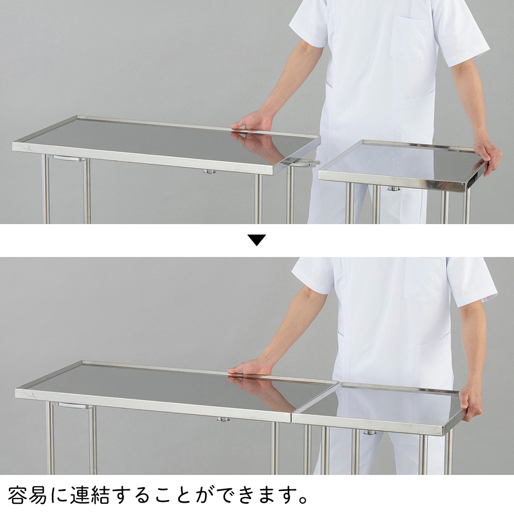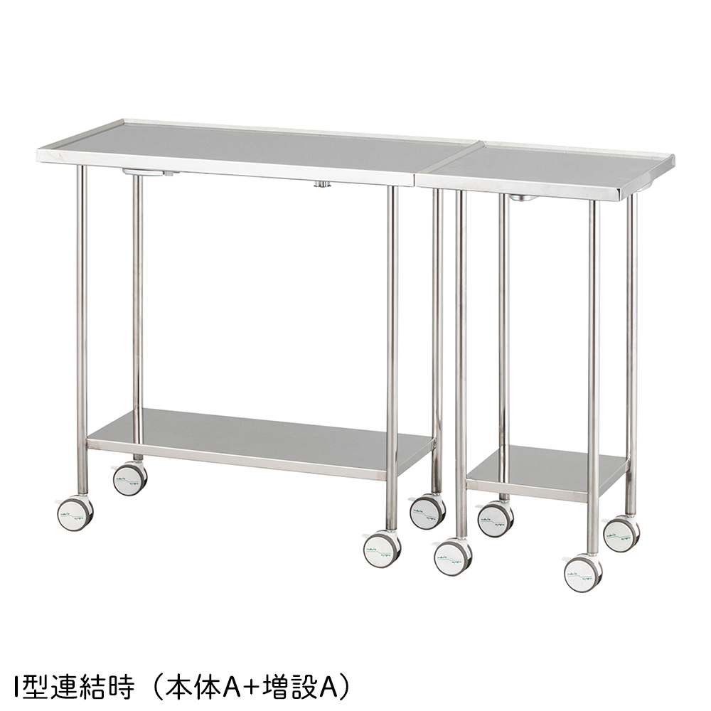 ●用途に合わせて増設できる器械台●状況に応じて、ワンタッチで増設して使える器械台です。●I型またはL型など自在に組み合わせて連結することができます。●本体テーブルと増設テーブルの連結だけでなく、本体テーブル同士、増設テーブル同士も連結することができます。●小型のAタイプと、大型のBタイプがあります。●連結してもキャスター同士は干渉しません。●幅×奥行×高さ(mm):1200×600×900●仕様:本体テーブル(Bタイプ)●材質:本体/ステンレス(SUS304)●耐荷重:15kg(均等荷重)●キャスター:φ75mmエラストマー製(四輪ストッパー付き)●※連結したまま移動すると、連結が外れる場合があります。