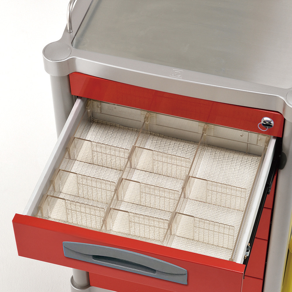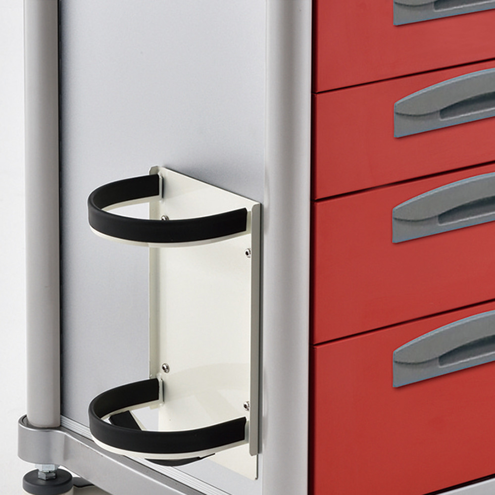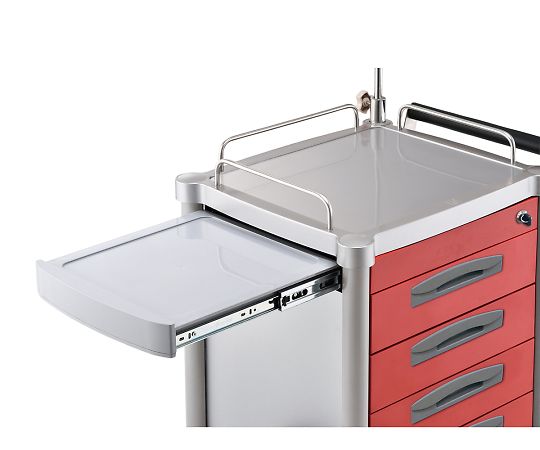 ●幅560mmのコンパクトな救急カートです。●1ヶ所で全ての引き出しを施錠できるセントラルロック方式です。●便利な補助天板付きですので、作業スペースを広く確保できます。●引き出しは静かに閉まる、ソフトクローズ構造です。●イルリガートルポールや蘇生板、酸素ボンベ架等が全て標準で付属しています。●デザイン性に優れた大型ハンドルで、操作性に優れています。●動きがスムーズな静音キャスターを使用していますので、移動時の騒音を低減しています。●多様な付属品を標準装備。すぐ使えて便利な救急ワゴンです。●色:レッド●幅×奥行×高さ(mm):560×475×1045(1120:ポール含む)●重量(kg):約50●材質:天板/ABS樹脂・ステンレス、引出し・支柱/アルミニウム、側板/アルミ複合板、イルリガートルポール/ステンレス●キャスター:Φ100mmエラストマー製(静音型・回転・旋回ダブルロック2輪付き)●天板サイズ:560×475mm●引出し有効内寸法:1~3段目/(幅)398×(奥行)360×(高さ)97mm、4段目/(幅)398×(奥行)360×(高さ)138mm、5段目/(幅)398×(奥行)360×(高さ)180mm●補助天板サイズ:360×350mm●バスケットサイズ:225×100×95mm●耐荷重:引出し/50kg、全体/200kg●酸素ボンベ架:500L用●付属品:イルリガートルポール、蘇生板(PP製)、ダストボックス(2個)、酸素ボンベ架、ワイヤーバスケット、仕切板セット(縦2・横8)×3段分、引出し用すべり止めマット、鍵×2本、六角レンチ2種類(各1本)
