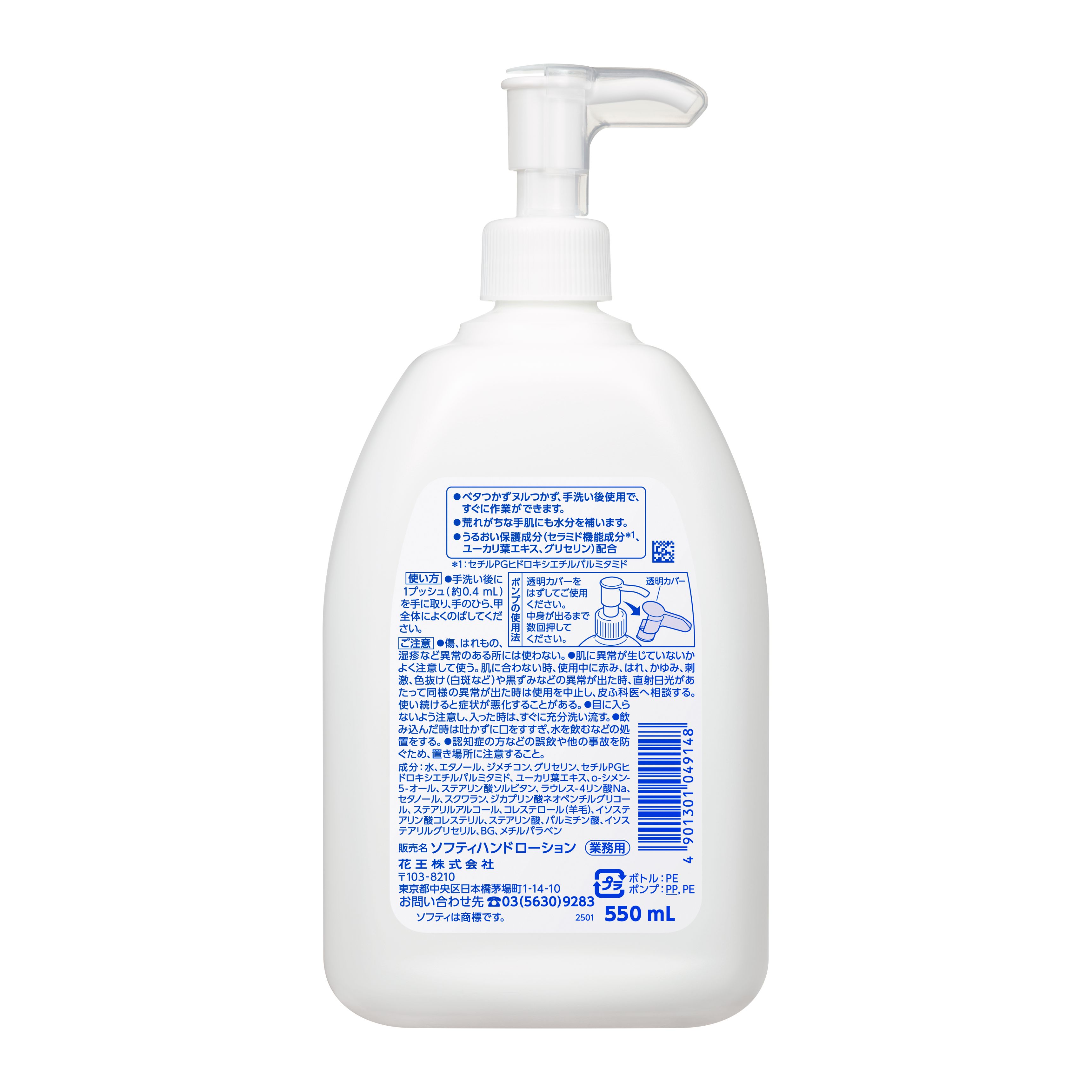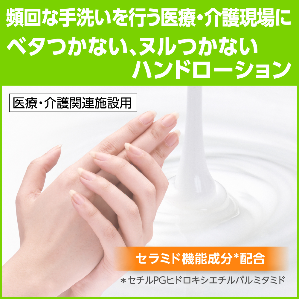 ●手洗い直後に使用する保湿用ハンドローション。●保湿成分(セラミド機能成分、ユーカリエキス)が肌の角層まで浸透。荒れがちな手肌にたっぷりのうるおいを補います。●サラッとした感触で、手洗い後つけてすぐ作業できます。●無香料。●〔ご注意〕:傷、はれもの、湿疹など異常のある所には使わない。●肌に異常が生じていないかよく注意して使う。肌に合わない時、使用中に赤み、はれ、かゆみ、刺激、色抜け(白斑など)や黒ずみなどの異常が出た時、直射日光があたって同様の異常が出た時は使用を中止し、皮ふ科医へ相談する。使い続けると症状が悪化することがある。●目に入らないよう注意し、入った時は、すぐに充分洗い流す。●飲み込んだ時は吐かずに口をすすぎ、水を飲むなどの処置をする。●認知症の方などの誤飲や他の事故を防ぐため、置き場所に注意すること。●主成分:水・エタノール・グリセリン・ジメチコン・セチルPGヒドロキシエチルパルミタミド・ユーカリエキス他●無香料●内容量(mL):550