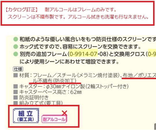 ●低床ベッドにも対応した全高62mmのキャスターベースです。●和紙のような優しい風合いをもつ防炎仕様のスクリーンです。●ホック式ですので、容易にスクリーンを交換できます。●別売の追加フレーム(0-9914-07・-08)と交換用クロス(0-9914-11~16)により使用シーンにあわせて増設できます。●幅×奥行×高さ(mm):900×400×1840●色:グリーン●材質:フレーム/スチール(メラミン焼付塗装)、布地/ポリエステル不織布(防炎加工)●キャスター:φ30mmナイロン製(2輪ストッパー付き)●キャスターベース高さ:62mm●重量:約4.5kg●防炎証明付き●組み立て式(要工具)●※スクリーンの柄は別注対応が可能です。