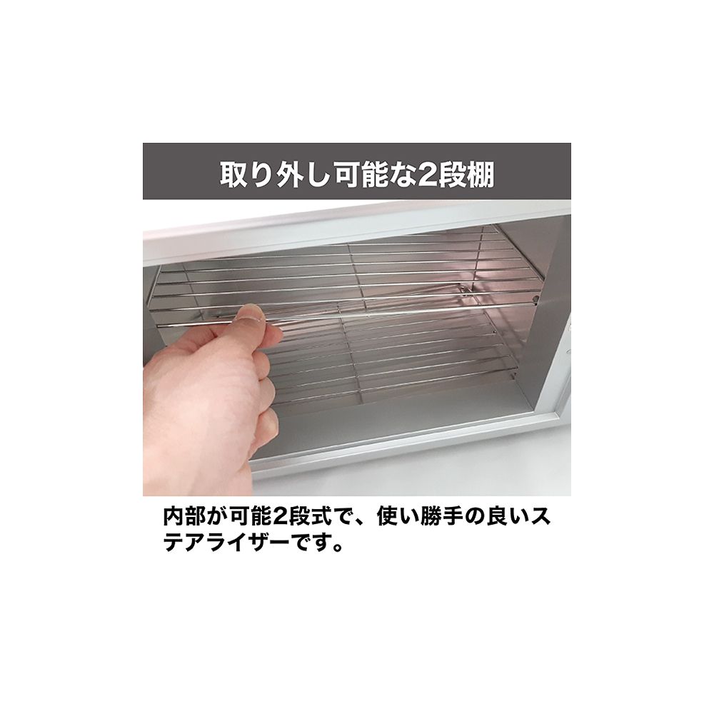 ●シンプルで使いやすいステリライザーです。●軽量設計でスリムなデザインです。●取り外し可能な2段の棚板付きです。●扉を開くと殺菌灯は消灯します。●殺菌灯は、高UV出力・長寿命(平均8000時間)タイプで、寿命期間中、殺菌線出力はほとんど変化しません。●型番:FV-209B●幅×奥行×高さ(mm):355×205×240●重量(kg):4●材質:本体/スチール(メラミン焼付塗装)、内装/アルミ●殺菌灯:8W(上部1灯)●棚網:2段(棚間隔:90mm)●庫内寸法:310×160×190mm●電源:AC100V 50/60Hz 12W●電源コード:分離型●電源コード長:1.6m