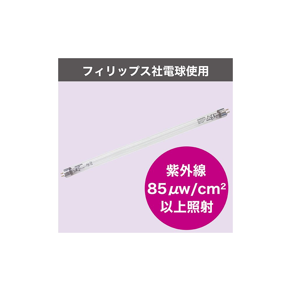 ●殺菌灯は、高UV出力・長寿命(平均8000時間)タイプで、寿命期間中、殺菌線出力はほとんど変化しません。●型番:交換用殺菌灯(フィリップス社製)