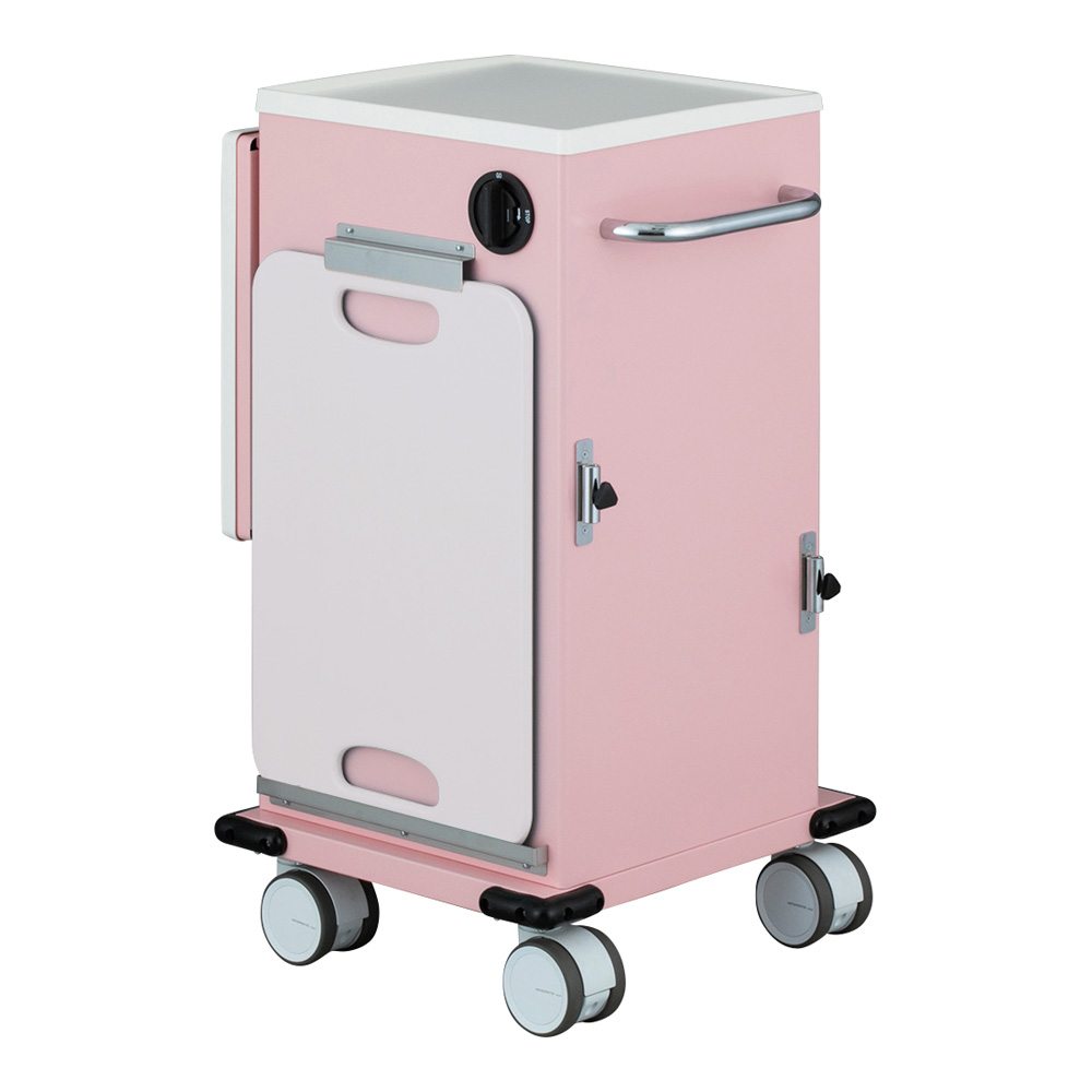 ●ハンドルの近くに設置したダイヤルを回すことでキャスターのストッパー操作を行います。●キャスターは四輪トータルロックで、キャスターの旋回と回転を同時にロックします。●キャスターにはベアリングが入っているため、スムーズさと静粛性に優れています。●引出しの最上段は鍵付きで薬品管理に適しています。●すべての引出しに別売の仕切板を取り付けられます。●樹脂天板のため、作業時に金属音が出ません。●手元の操作で四輪ロック●色:ピンク●幅×奥行×高さ(mm):584×510×955●★入数:1個●材質:本体/スチール(塗装仕上げ)、蘇生板/HDPE(高密度ポリエチレン)、仕切板/PVC(塩化ビニル樹脂)●引出し有効サイズ:小/367×323×51mm、中/367×323×135mm、大/367×323×240mm●補助天板サイズ:456×426mm●仕切板取付可能数:中・小/各5枚(縦・横)、大/5枚(横)●キャスター:Φ100mmエラストマー製(4輪トータルロック、旋回・回転ダブルロック)●重量:約50kg●付属品:蘇生板×1枚