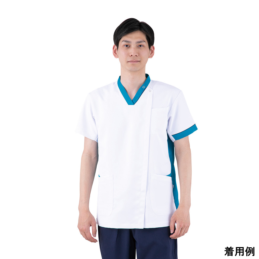 ●着脱しやすいサイドファスナー開きのデザインスクラブです。●襟と袖口の配色パーツがデザイン性と標識性を高めています。●特殊仕上により吸水、防汚効果があります。●業務用洗濯にも耐えうる形態安定素材です。●色:ターコイズ●サイズ:M●入数:1枚入●素材:ポリエステル100%(制電糸入)●左胸(PHSポケット付き)、両腰二重ポケット付き●胸囲:103cm●着丈:70cm●肩巾:44cm●袖丈:20cm