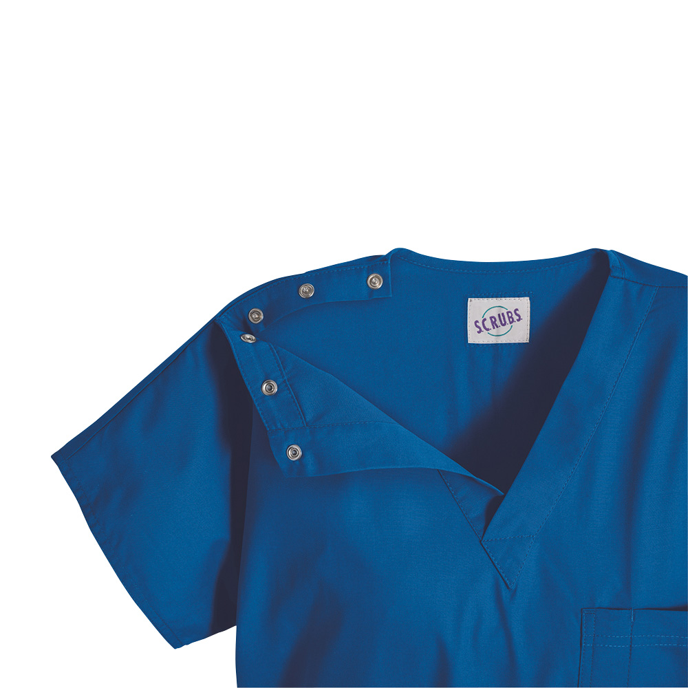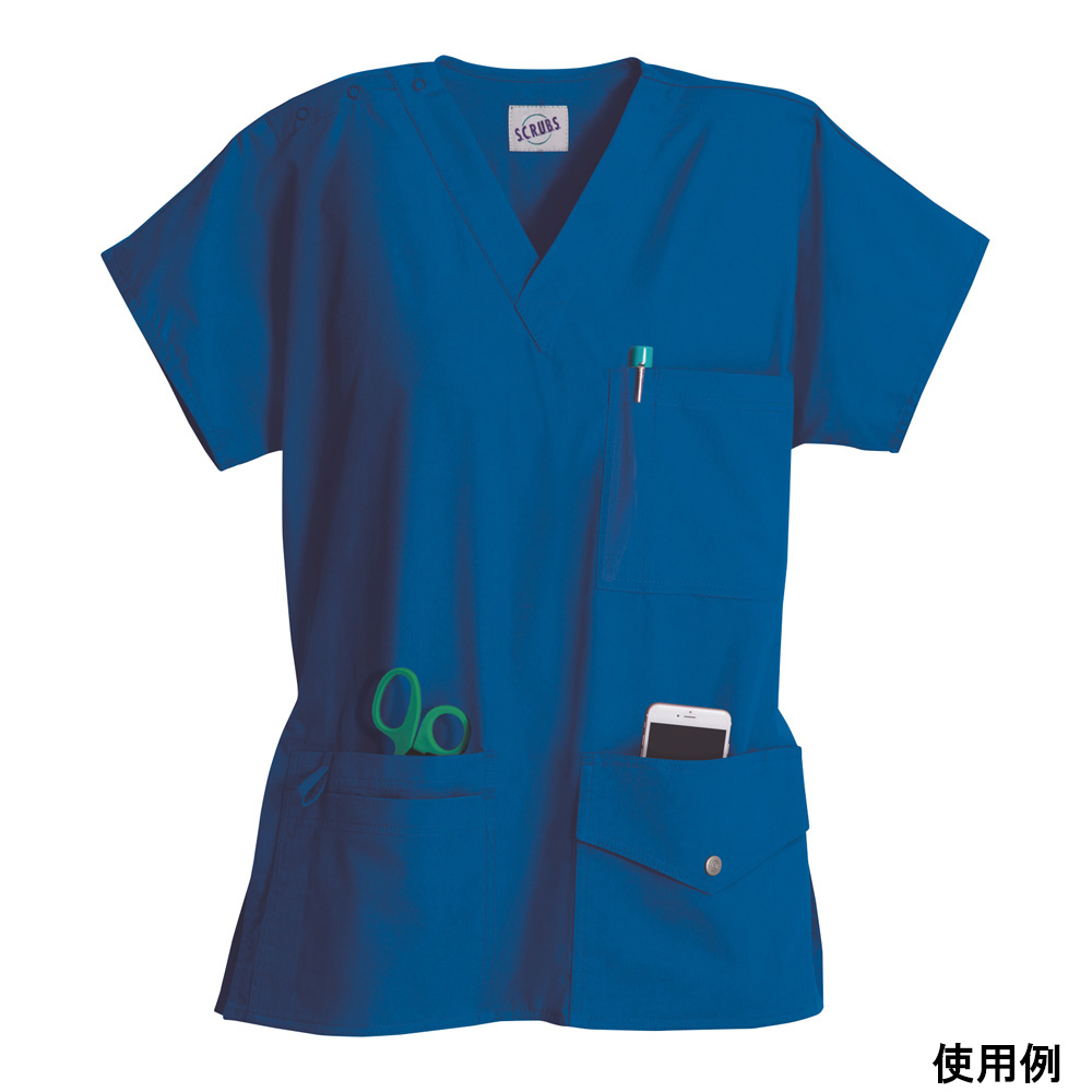 ●柔らかな肌触りと耐久性を備え、ポケットの多さ(6つ)が魅力の男女兼用スクラブです。●襟元のVネックは形が崩れないよう三角形に縫製それており、内側の肌に触れる面も気遣った強化縫製です。●生地は一度プレウォッシュ済(予め洗濯・乾燥済)のため、色落ちと縮みが最小限に抑えられています。●カラー:ロイヤル●サイズ:XS●素材:ポリエステル65%、綿35%●肩スナップボタン・裾サイドスリット仕様●ポケット:ペンスロット付き胸ポケット×1、裏面胸ポケット×1、深めサイドポケット×3、スナップ付ポケット×1●※米国仕様サイズのため、通常より1つ下のサイズをお勧めします。●胸囲:96.5cm●着丈:67.5cm●裄丈:35cm